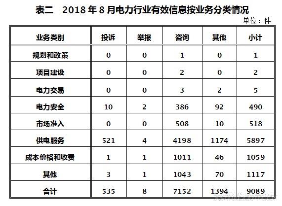 收到的投訴舉報(bào)中,電力行業(yè)類(lèi)543件,占96.79%。新能源和可再生能源行業(yè)類(lèi)共18件,占3.21%。電力行業(yè)的投訴舉報(bào)中,電力安全方面12件,占2.21%;供電服務(wù)方面525件,占96.68%;成本價(jià)格和收費(fèi)方面2件,占0.37%;其他方面4件,占0.74%。(2018年8月電力行業(yè)有效信息按業(yè)務(wù)分類(lèi)情況見(jiàn)表二)。