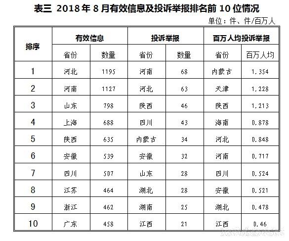各?。ㄗ灾螀^(qū)、直轄市)按照收到的有效信息數(shù)量排序,河北、河南、山東、上海、陜西等列全國(guó)前10位;按照投訴舉報(bào)數(shù)量排序,河南、河北、陜西、四川、內(nèi)蒙古等排在全國(guó)前10位。按照百萬(wàn)人均投訴舉報(bào)數(shù)量排序,內(nèi)蒙古、天津、陜西、海南、河北等排在全國(guó)前10位。(2018年8月有效信息及投訴舉報(bào)排名前10位情況見(jiàn)表三)