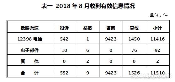 按反映渠道分類(lèi),12398電話11416件,電子郵件92件,其他2件。(2018年8月收到有效信息情況見(jiàn)表一)