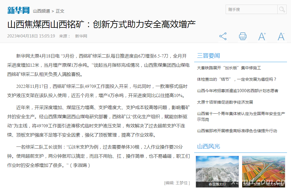 2022年11月17日,西銘礦綜采二隊(duì)49709工作面投入開(kāi)采,與此同時(shí),一款滑移式臨時(shí)支護(hù)液壓支架在該隊(duì)投入使用,近五個(gè)月來(lái),增產(chǎn)4萬(wàn)余噸,開(kāi)采進(jìn)度同比以往提高10%。近年來(lái),開(kāi)采深度增加、煤層壓力增高、支護(hù)難度大、支護(hù)成本較高等問(wèn)題,影響著礦井的安全生產(chǎn)。經(jīng)山西焦煤集團(tuán)西山煤電研究部署,西銘礦以“優(yōu)化生產(chǎn)組織,賦能創(chuàng)新驅(qū)動(dòng)”為主線,將49709工作面引進(jìn)滑移式臨時(shí)支護(hù)液壓支架,有效解決了過(guò)去超前支護(hù)不連續(xù)、頂板支護(hù)強(qiáng)度不足等不安全因素,強(qiáng)化了頂板管理,提高了作業(yè)效率。一名綜采二隊(duì)工長(zhǎng)談到:“以8米支護(hù)為例,過(guò)去需要單體30根,2人作業(yè)操作要20分鐘。使用超前支護(hù),兩分鐘就可以搞定,而且不用抬、扛,操作簡(jiǎn)單,也不易磕碰,職工們作業(yè)時(shí)的安全感增加了很多?!?/p>
