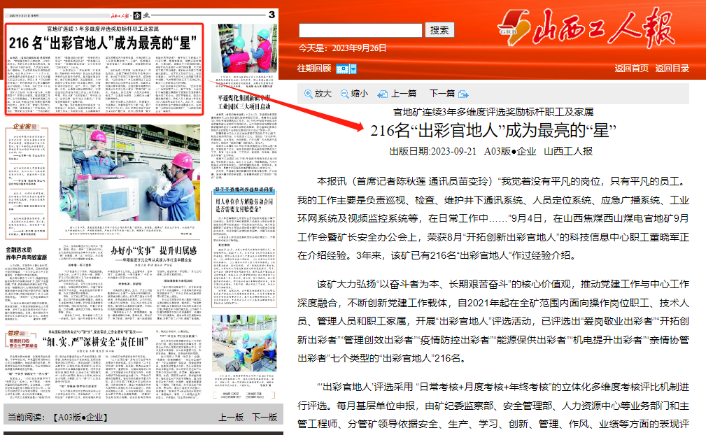 該礦黨委副書記郭凡說,“出彩官地人”的評(píng)選聚了人心、鼓了干勁,為推動(dòng)礦井高質(zhì)量發(fā)展提供了堅(jiān)強(qiáng)的思想保障和強(qiáng)大的工作合力。該礦井智能化、數(shù)字化建設(shè)穩(wěn)步提升,單班入井人數(shù)由3年前的700人減至現(xiàn)在的450人,2021年、2022年連續(xù)兩年生產(chǎn)原煤實(shí)現(xiàn)最高水平,還榮獲 “山西省科技創(chuàng)新煤礦” “山西省功勛企業(yè)”等稱號(hào)。