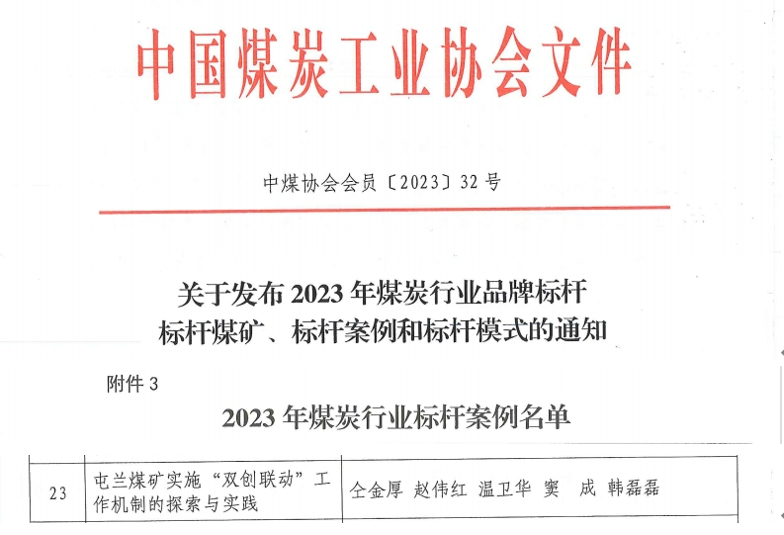 近日,中國煤炭工業(yè)協(xié)會(huì)發(fā)布2023年煤炭行業(yè)品牌標(biāo)桿、標(biāo)桿煤礦、標(biāo)桿案例和標(biāo)桿模式,《屯蘭煤礦實(shí)施“雙創(chuàng)聯(lián)動(dòng)”機(jī)制的探索與實(shí)踐》獲評(píng)2023年煤炭行業(yè)標(biāo)桿案例,這也是該案例繼入選煤炭行業(yè)黨建工作品牌優(yōu)秀案例、第六屆全國基層黨建創(chuàng)新典型案例、全國企業(yè)黨建創(chuàng)新優(yōu)秀案例后獲得的又一榮譽(yù),充分展現(xiàn)了山西焦煤西山煤電屯蘭礦(下稱“屯蘭礦”)在黨建工作方面的實(shí)踐成果和管理經(jīng)驗(yàn),發(fā)揮了行業(yè)標(biāo)桿示范引領(lǐng)作用。