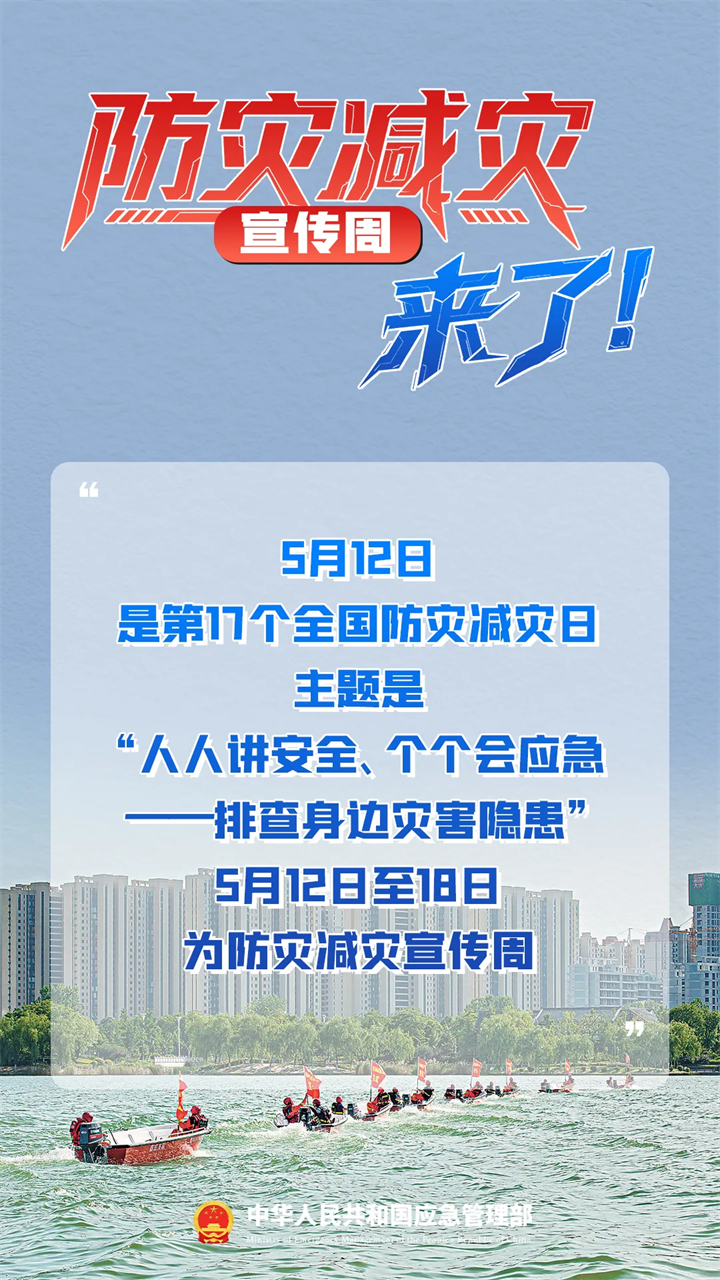 今天(5月12日),是第17個(gè)全國防災(zāi)減災(zāi)日,主題是“人人講安全、個(gè)個(gè)會(huì)應(yīng)急——排查身邊災(zāi)害隱患”,5月12日至18日,為防災(zāi)減災(zāi)宣傳周。